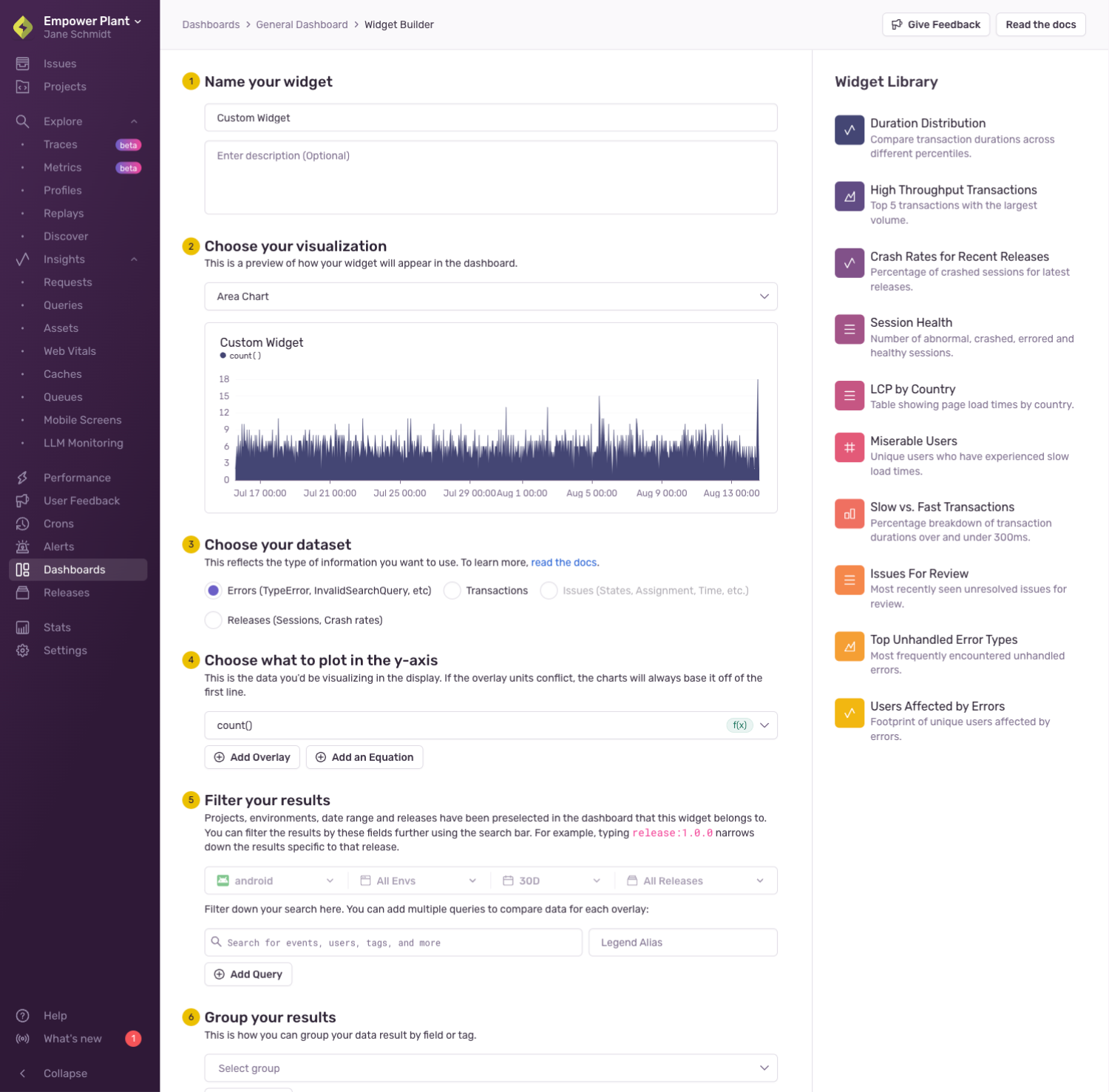 In the dataset selection step, choose which type of data you would like to use in your widget. This data is classified into four different datasets: errors, transactions, issues, and releases.